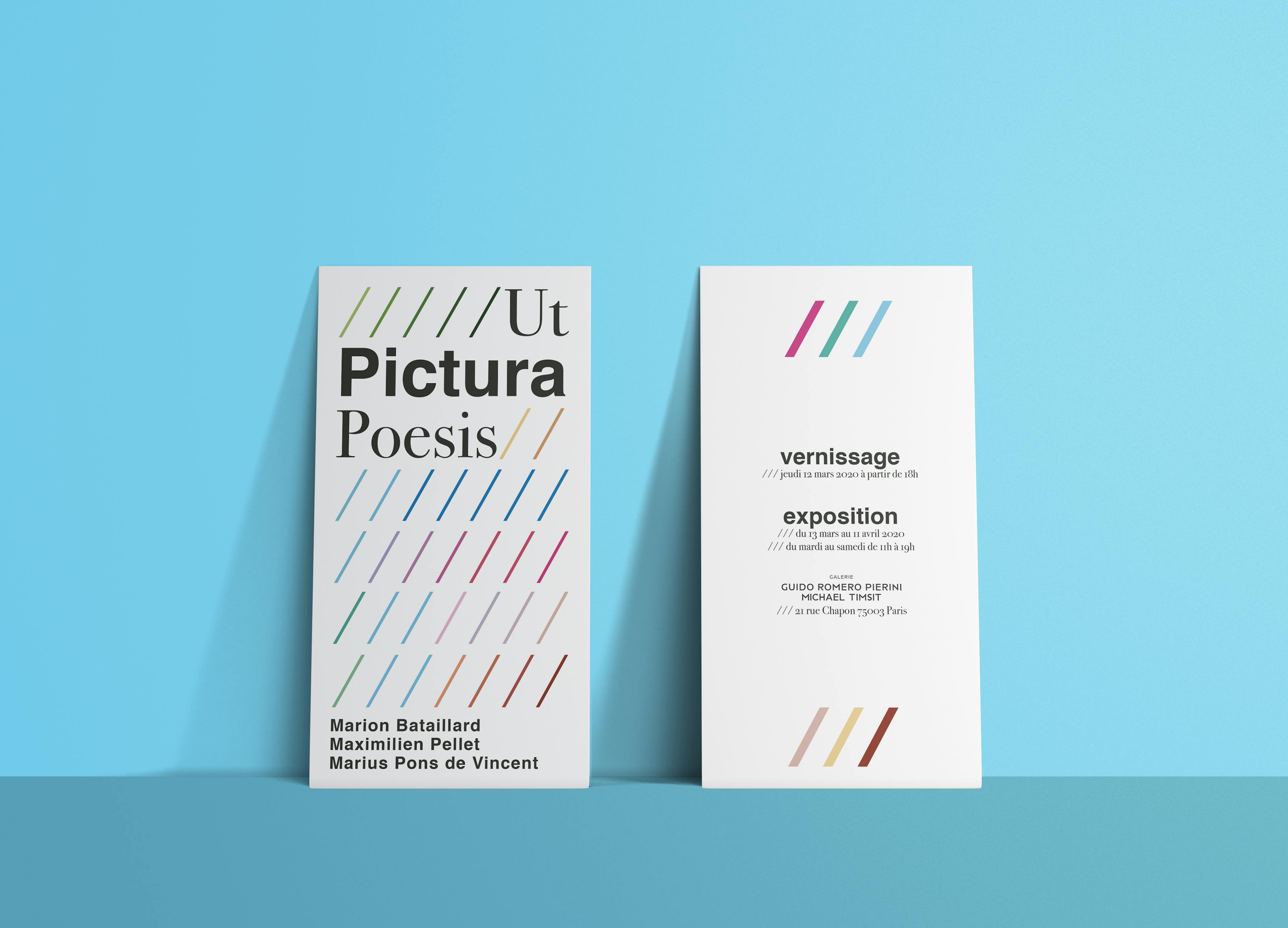 UtPicturaPoesisisanexhibitionthatbringstogethertheworkofthreeartists:MarionBataillard,MaximilienPelletandMariusPonsdeVincent.Basedonprinciplesofsemiotics,wehavemadetheslash-amarkofoptimismintheWest-thesoleexpressivecharacteroftheposterandcatalogcover.Atoncedrawing(pictura-painting)andwriting(poesis-poetry),eachstrokebecomesthecommondenominatorofthethreeartists,andofallthosewhowillbeexhibitedinthefutureinthesameconfiguration.Eachhueinthechromaticrangeistakendirectlyfromtheworkspresentedintheexhibition.