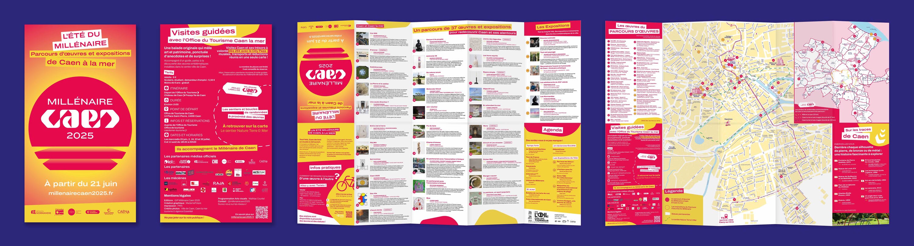 En2024,l'agenceMPAaeuleprivilèged'êtrechoisieparleGIPduMillénairedeCaenpourconcevoirl'ensembledessupportsdecommunication.Aprèsavoircrééunvisuelfort,festifetemblématiquepourcélébrerlesmilleansdelaville,l'agenceMadamePolareAtelieraimaginétouteslesdéclinaisonsnécessairespourcommuniquerautourdecetévénementphare.Notreéquipeaconçulesaffichesprésentantlesprincipauxmomentsdecetanniversaire,toutenprenantencompteunegrandevariétédesupports,telsqueledossierdepresse,leprogramme,lesautocollants,lesvitrophanies,ainsiquelessupportspublicitaires(banderoles,drapeauxàventouse,macarons,etc.).